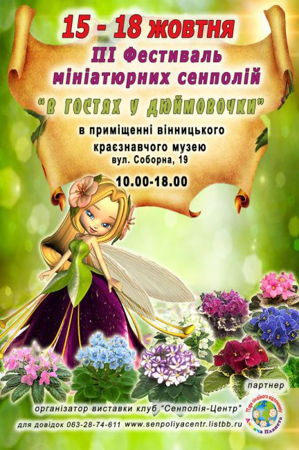Шановні фіалколюби! У Вінниці знову проходитеме щорічний фестиваль мініатюрних сенполій "В гостях у Дюймовочки". Зануритись у дивовижний та казковий світ крихітних кімнатних фіалок ви зможете, відвідавши унікальну виставку , яка буде проходити 15-18 жовтня у виставковій залі Вінницького краєзнавчого музею, що по Соборній 19. Двері виставки відкриті для відвідувачів з 10.00 до 18.00. Ласкаво просимо!