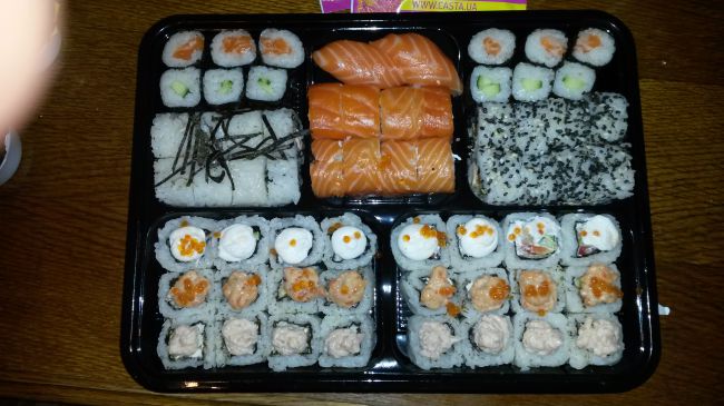 Всем доброго времени суток! Как мы заказали суши в ресторане Каста. Воскресенье стояла прекрасная осенняя погода, располагающая к прогулке по красивым историческим местам славного города Киева. После семейной прогулки, по городу Киеву насладившись пейзажами и свежим воздухом, увидев в метро рекламу суши от ресторана Каста, решили заказать суши весом 1400грамм для большой компании, ценой 169грн. с доставкой на дом. С первого раза на номер Киевстара дозвониться не удалось, была 6я в очереди, устала ждать, позвонила на мтс, оставила заявку, чтоб мне перезвонили. Подождав 5минут, набрала еще раз, ответил оператор, у меня попросили 2й номер телефона, не понимаю, зачем второй номер, ну да ладно сообщила второй номер. Сказала что нам нужно 6 приборов, и что меня удивило, сюрприз, упаковка стоит денег +11грн к сумме заказа итого заказ мне обошёлся в 280грн, пообещали доставить заказ в течение 2х часов, но доставили раньше, молодцы постарались.
