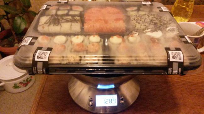 Решила сделать контрольное взвешивание своего заказа, на кухонных электронных весах, фото всего прилагаю. И вес оказался меньше вместо 1400грам у меня 1289грамм??? итого не хватает 111грамм, но еще же есть упаковка, которая тоже имеет свой вес, она весит 76грамм, итого все вместе составляет 187грамм. Открываем сайт касты: раздел: роллы самый дешевый: Саке маки- ролл с лососем- весом 100/25грамм по цене 49грн. но у меня вес 187грамм итого можно выбираем другой Чизу ролл 180/25 грамм Сырный ролл с хрустящей курицей и помидором, соусом Цезарь и салатом Айсберг цена 59грн. это если просто брать аналогичный товар.