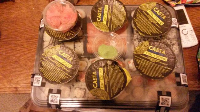 Но, сюрпризы на этом не закончились… больше мое удивление было, когда дома, достав из пакета свой заказ, я увидела что васаби 1шт, имбиря тоже 1шт, соевый соус 6шт, влажные салфетки 6шт. приборов тоже как попросила. Мне не понятно, почему оператор не сообщает чем и как комплектуется заказ, так как набор весом 1400грамм в рекламе на 5человек, так почему васаби и имбирь по 1шт??? и оператор же понимал что заказ на 6человек….