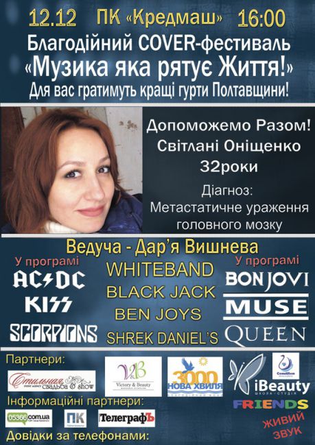 12.12.2015 у ПК ’Кредмаш’ відбудеться благодійний COVER - фестиваль для збору коштів на лікування Світлани Оніщенко (Мацюк) 32 роки