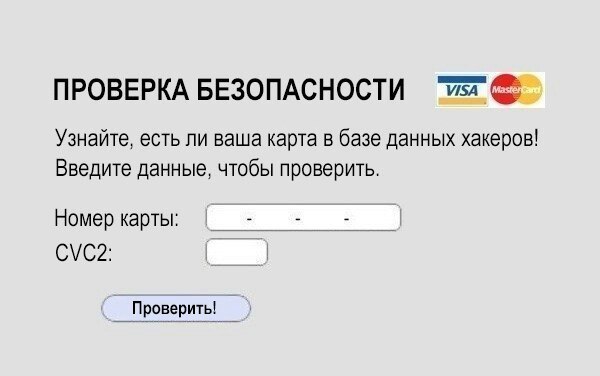Хакеры и мошенники вместе взятые придумали новую схему разводки....в виде проверки безопасности. Ведь кто то попробует проверить! Будьте бдительны господа! Не вводите данные своей банковской карты! Поделитесь с друзьями!
