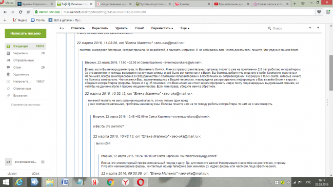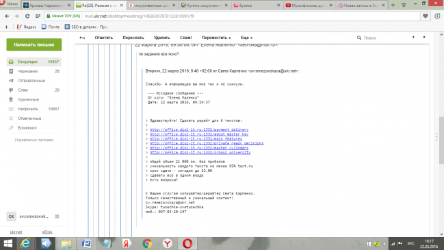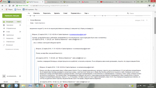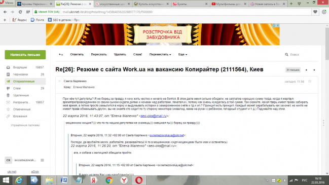 Девушка предлагает работу копирайтерам, загруженность 100% по 7-10 грн за 1000сим. Я написала, что готова работать за 20, она охотно согласилась. Тут меня и терзанули сомнения. Пишу ей чтоб скинула свои контакты и информацию о фирме или частном лице для проверки. На что она соглашается и даже готова платить ежедневно. Ладно думаю, посмотрим. сегодня утром присылает задание на 20 тис. символов, нормально так да. я ей пишу, что возьмусь за работу только когда получу информацию которую просила. она начинает нервничать и говорит: «вам это так важно, вы что из сбу?» пишу: а Вас бы это смутило?" она:«да, мы маленькая честная компания, которой не нужны проблемы с прав.органами». я:«ну если Вы чисты, тогда нечего боятся». она мне начинает писать, что я не за работой обратилась, а повынюхивать))))))))))))))))))) я больше не стала разглагольствовать, написала, что вынуждена сообщить в кругах копирайтеров про нового мошенника, на что она ответила, что ей пофиг и обозвала меня очередной блогершой, которая ищет интрижки)))))))))))))) я ответила, что она нищенка и ею же и останется если будет действовать по такой схеме. на что она рассмеялась и сказала, что мошенники не нищие, типа, посмотри на депутатов.