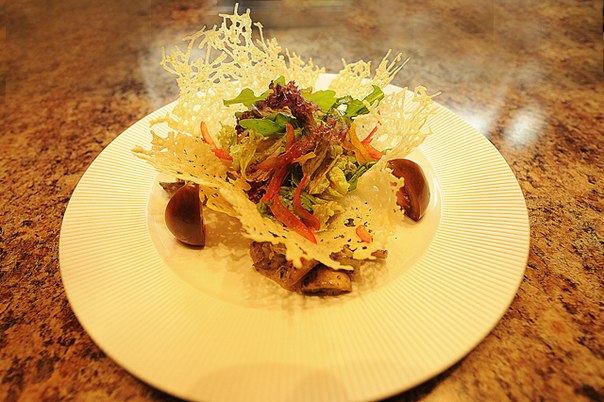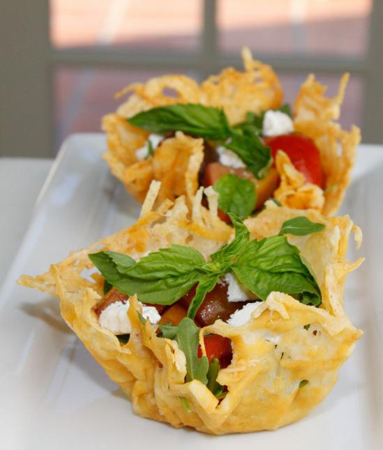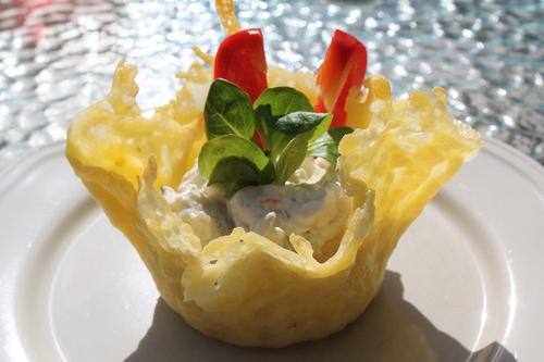 Существует множество оригинальных способов подачи закусок и салатов к праздничному столу или фуршету. И сырные корзиночки, пожалуй, наиболее эффектный из всех. Ваши гости оценят по достоинству необычное украшение, которое, к тому же придает блюду пикантный вкус. Второй вариант приготовления. Натрите на тёрке пармезан и насыпьте тонким слоем на сухую сковороду. Учтите, что если вы хотите получить ажурные корзинки, то сыра должно быть не слишком много! Как только получившаяся лепёшка начнёт плавиться, нужно снять сковороду с огня и дать ей немного остыть. Аккуратно снимите сыр лопаткой и положите её на перевернутую тарелку или стакан. Помните, что от формы посуды будет зависеть форма корзинки. Учитывая этот фактор, вы легко сможете сделать сырные корзиночки для салатов и закусок. Поместите сырные заготовки вместе с формой в холодильник и дайте им полностью остыть. Наполнять их следует непосредственно перед подачей, чтобы основа не успела пропитаться жидкостью и стать слишком мягкой. Рецепт сырных корзиночек с креветками. Приготовьте основу для салата так, как это было описано выше. В нашем случае будет лучше, если в качестве формы вы будете использовать не слишком большое и не слишком глубокое блюдо. Для начинки измельчите один пучок зеленого салата, один крупный розовый помидор, две дольки чеснока и 40 крупных жареных креветок. Смешайте все продукты и заправьте их соусом из растительного масла (две столовые ложки), жидкого меда (одна чайная ложка) и чайной ложки лимонного сока. Готовый салат посыпьте кунжутом и разложите по корзинкам.