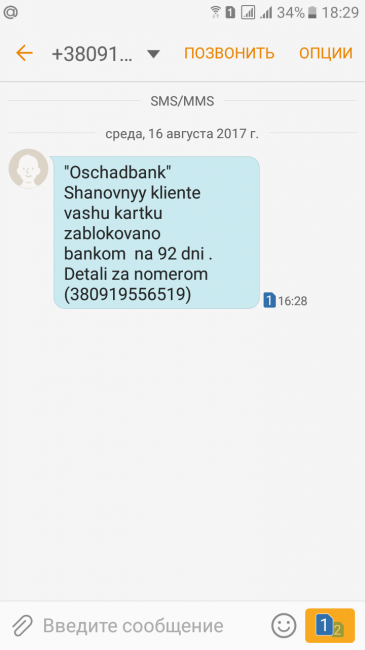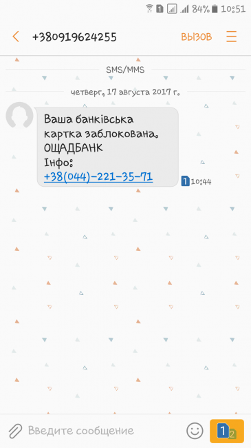 Пришла сегодня смс-ка с номера +380919624255 "Ваша банківська карта заблокована. ОЩАДБАНК. Інфо: +38(044)221-35-71.