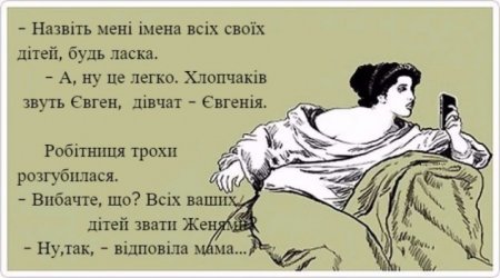– Ну так, – відповіла мама. – І, скажу я вам, це дуже зручно. Вранці я кричу: «Женя, вставай», – і всі дітлахи прокидаються. Коли їх потрібно погодувати, то я кажу: «Женя, їсти», – і вони всі вдаються на кухню. Якщо хтось бавиться, то я грізно кричу: «Женя, припини», – і всі діти миттю затихають. Мені здається, що це прекрасна ідея!