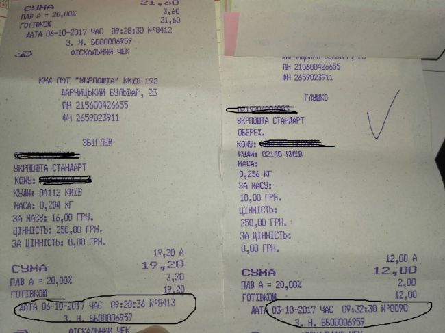 отправлены с одного отделения, по Киеву 3го числа масса чуть больше даже, по второму фото масса больше чем в 2 раза была больше, а чек дешевле