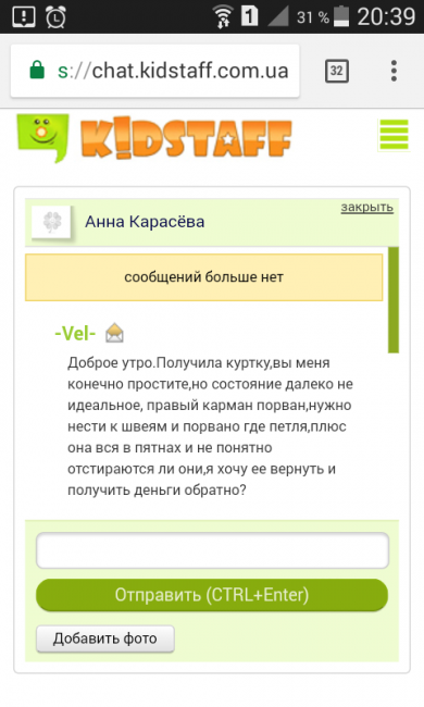 В связи с вышеизложенным я категорично не рекомендую ее как продавца. Я считаю, что многие люди б\у вещи покупают не от хорошей жизни, и может для кого-то эти 360 грн,были последние и человек хотел одеть любимое чадо, а благодаря это Леди, человек в итоге попал еще на деньги.