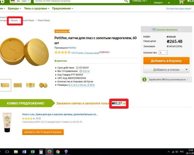 Petitfee, патчи для глаз с золотым гидрогелем, 60 шт 265.48