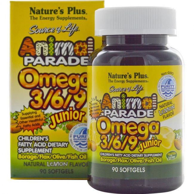 Nature´s Plus, Источник жизни, Парад животных, Омега 3/6/9 для детей, Натуральный лимонный вкус, 90 желатиновых капсул