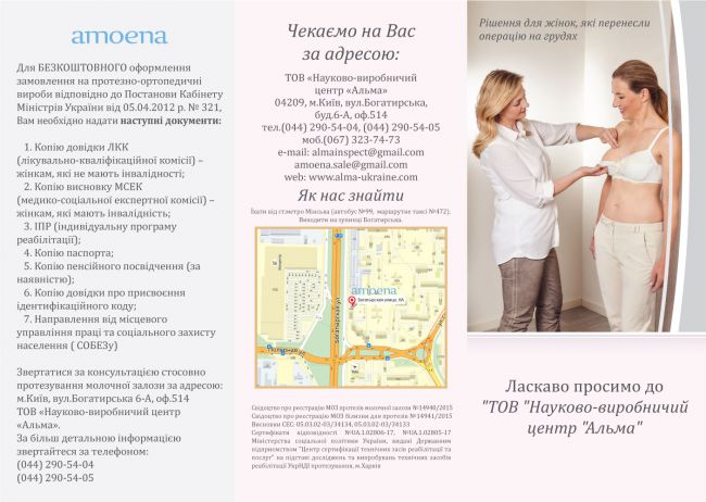 Добрый день. Хочу проинформировать целевую аудиторию , ТОВ "Научно-производственный центр"Альма" , занимается БЕСПЛАТНЫМ обеспечением женщин протезами молочной железы,лифами и компрессионными рукавами. Протезы производства (Германия) бренд AMOENA- мировой лидер в отрасли производства продуктов после оперативного вмешательства на груди и белье Латвия. Бесплатное обеспечение выполняется согласно постановлению кабинетов министров Украины №321 по всей Украине. Так же Хочу сообщить,что с недавних пор центр "Альма" заключил договор с Департаментом социальной политики Киевской городской адм. где предусмотрено финансирование этой группы изделий по городской целевой программе "Турбота.Назустріч киянам"116/116. Будем рады Вас видеть у нас в комфортном салоне,где Вы сможете получить квалифицированную консультацию и максимально комфортное протезирование.
