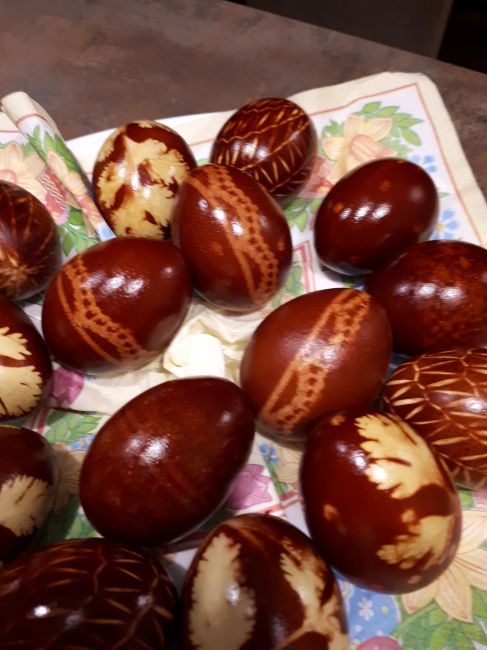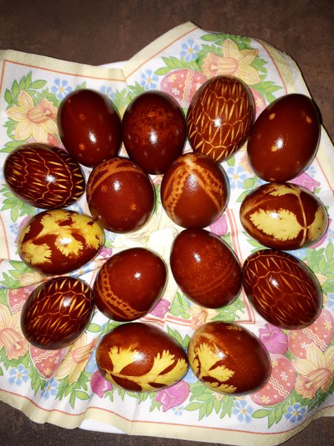 Первый раз кружево использовала - понравилооооось) Приготовила отвар из луковой шелухи и давай стараться))) листочки петрушки и кинзы, бинт, сетка от лука - впервые))) и кружево разное, что дома было. Сразу оговорюсь - нежное и тонкое еле заметно, а с явно выраженным рисунком - самое оно) может кому пригодится - достаточно быстро, ну и маслом для блеска))