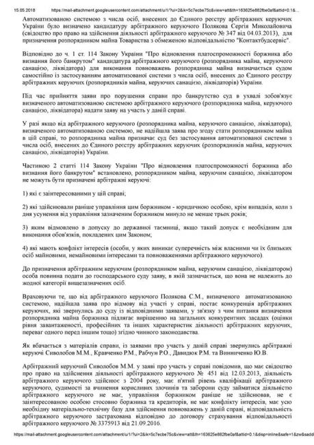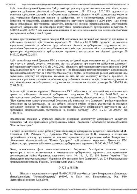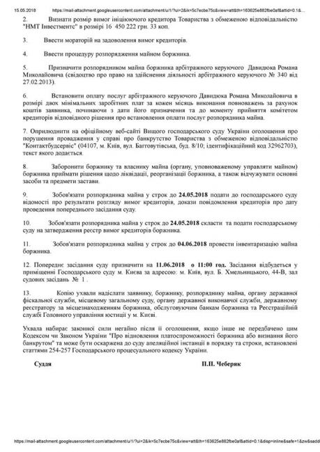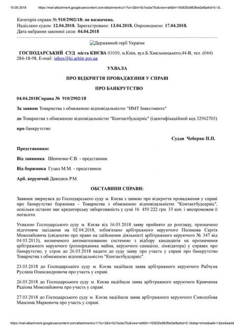 Зокрема, з інформації, що міститься у Єдиному державному реєстрі судових рішень України, оприлюдненої 17.04.2018, вбачається, що ухвалою господарського суду м. Києва у справі № 910/2902/18 від 04.04.2018 Про відкриття провадження у справі про банкрутство, зокрема: