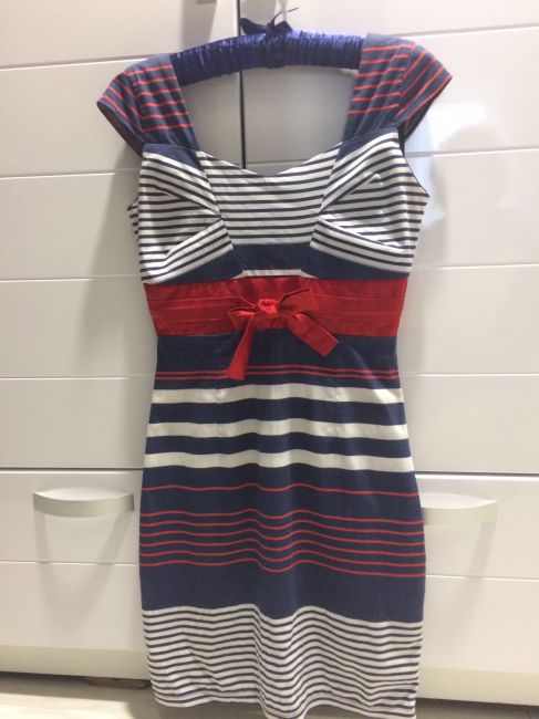 3. Платье в полоску (с небольшим нюансом, есть небольшой порез размером с горошину, но кто умеет устранит, а я не умею(. А так состояние отличное). На фото видно. Размер S.