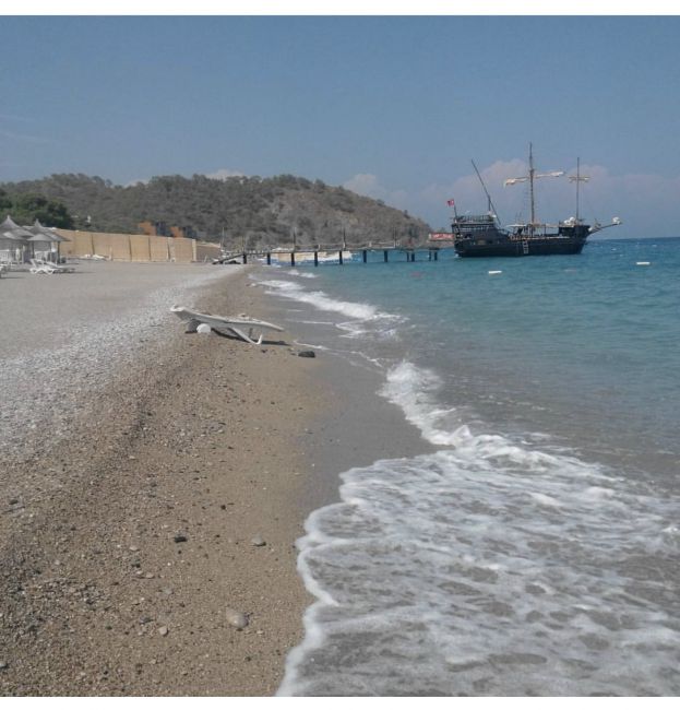 Своего пляжа нет, есть выход на общественный Клеопатра бич. Здесь можно отдыхать на своём покрывале или арендовать зонт и шезлонг ( или что то одно) цена каждого 10 турецких лир.