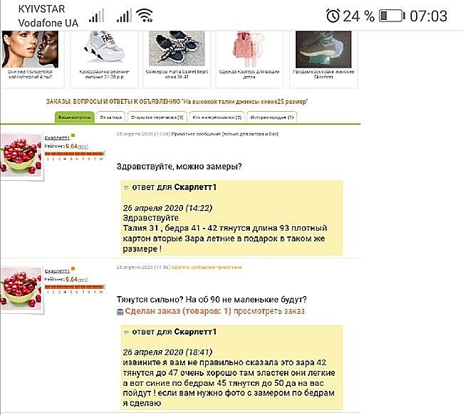 Ув девчонки первый раз такое получила негатив в отзыве за НЕВЫСОКУЮ посадку в джинсах при просьбе замеров она их не брала НИГДЕ только бедра и талию - у нас была акция вторые в подарок и когда копировала я замеры случайно отправила ей замеры подарочных ,но извинилась и прислала ей замеры купленных и что бы покупатель был уверен предложила ей фото ЗАМЕРОВ но она никак не ответила - в отзове по негативу я в ответ выставила фото с джинсами с ПОСАДКОЙ - покупатель пишет - я вру по ОБ ,где же я НАВРАЛА ЕЙ ? фото делала для нее вечером ОНИ просто были сделаны для ее , единственное я подарки вложила моя вина! Оценка от покупателя: негативная