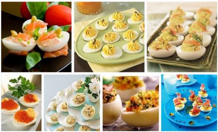 25. Гусиную печень нарезать тонкими ломтиками и обжарить вместе с нарезанным кольцами луком, перемешать желтки со сливочным маслом и соусом бешамель, заправить солью, черным перцем и коньяком, фаршированные яйца полить сверху белым соусом.