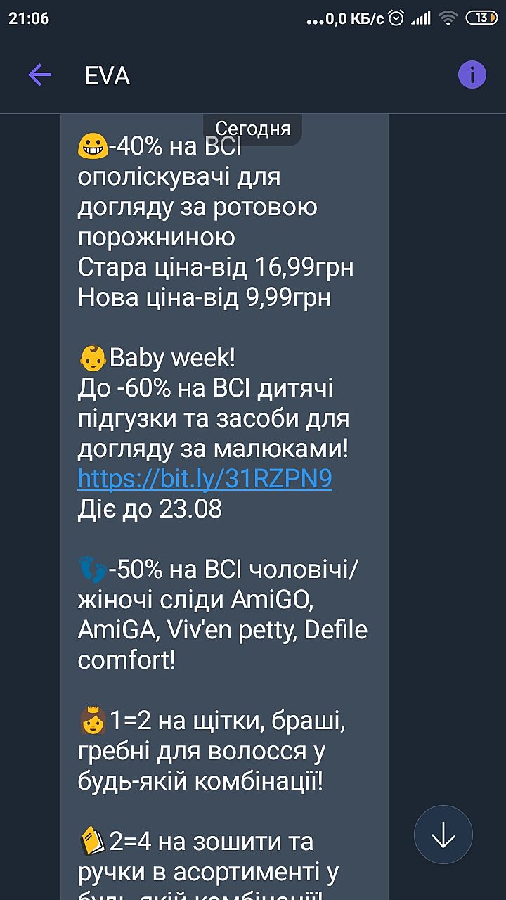 Добрий вечір.не знаю можливо вже писали, сьогодні була в Єві,на туші для вій акція,повернули 80% кешбеку і в подарунок дали блиск для губ,прокладки олвейс по13грн,інше не дивилась,але казала кума на порошок пральний теж хороша скидка.