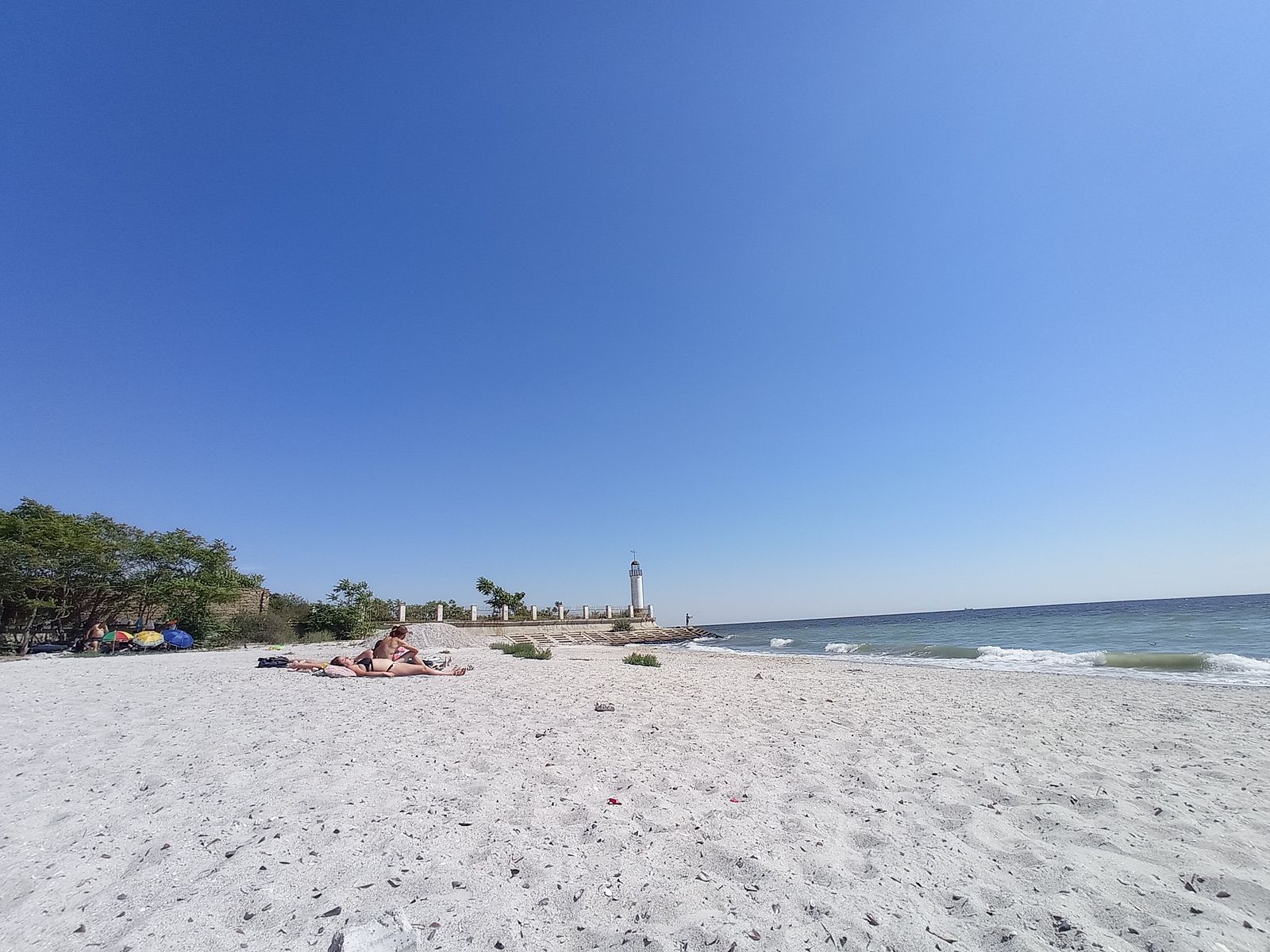 Морське, пляж перед маяком ( на фото видно стирчить)