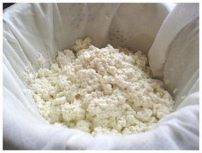 1 литр (я брала домашнее) нагреваете до кипячения, как только начнет подниматься добавить 1 ч. л 9%-го уксуса. Молоко свернется, поварить еще минуты 2-3 и процедить эти хлопья через марлю в 2 слоя. Положить под пресс на 2 часа.