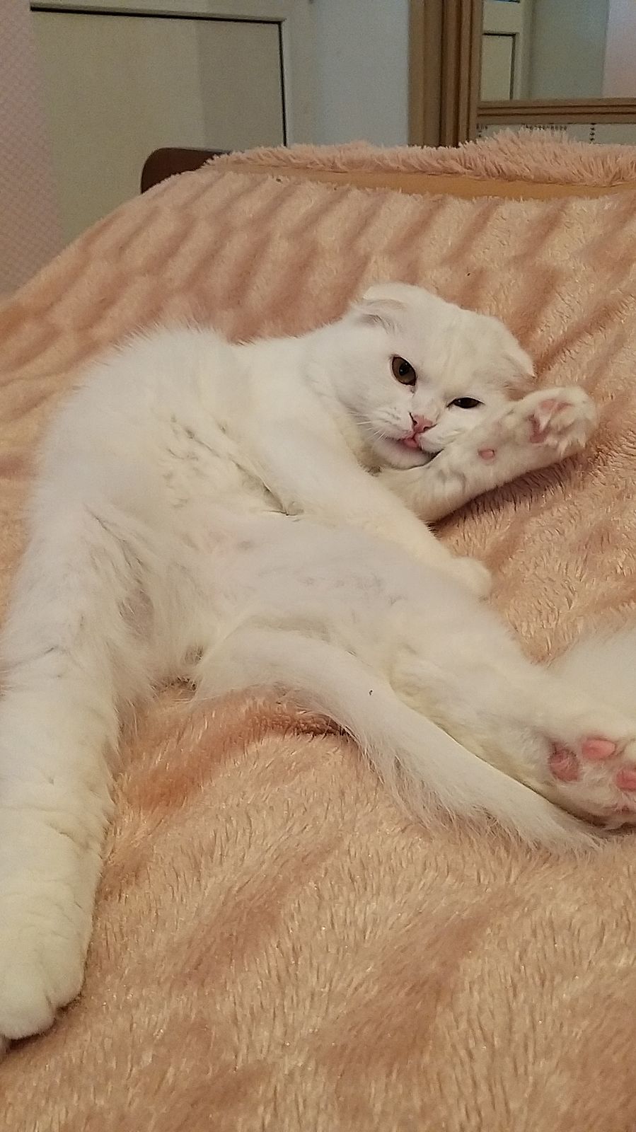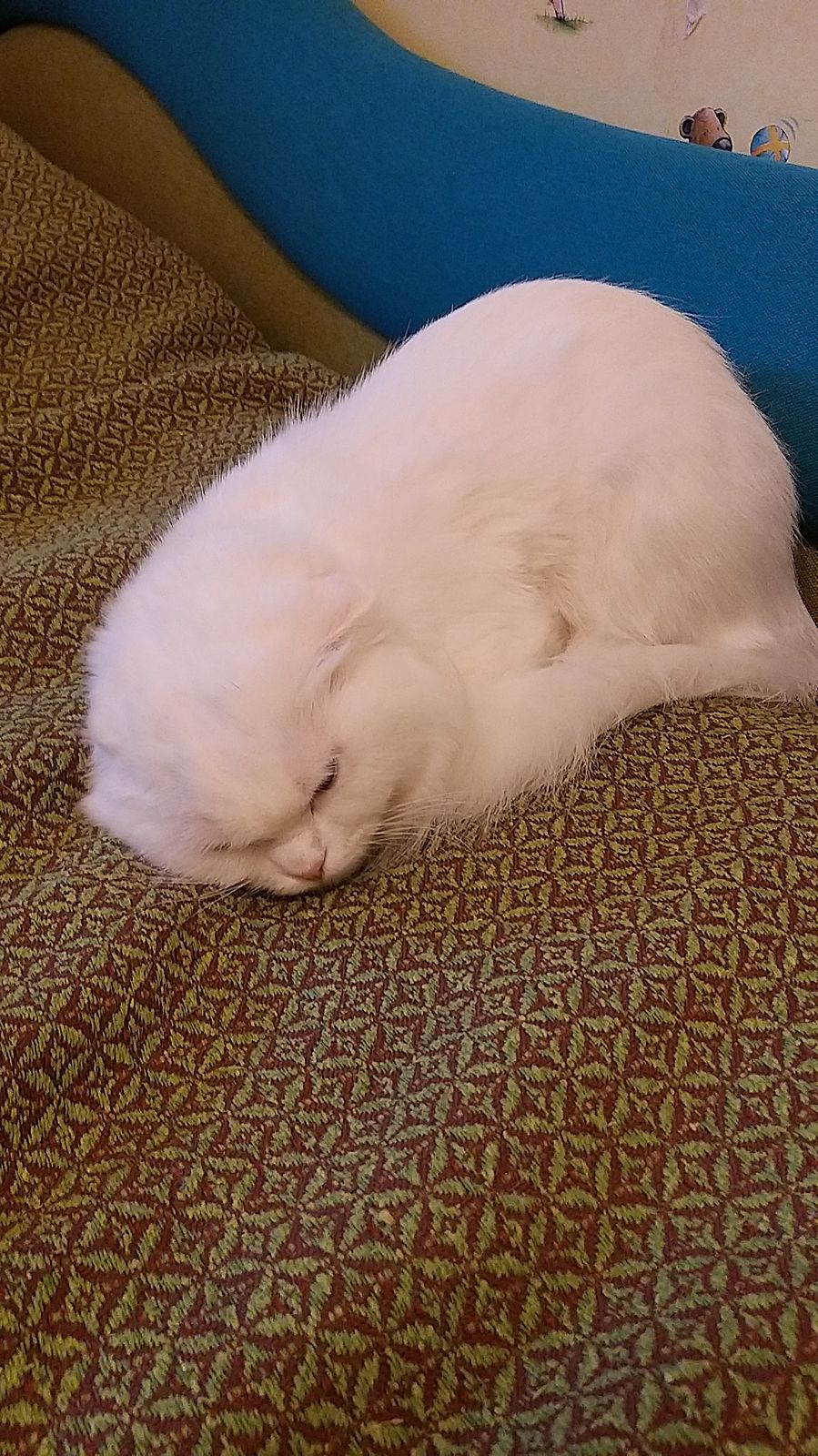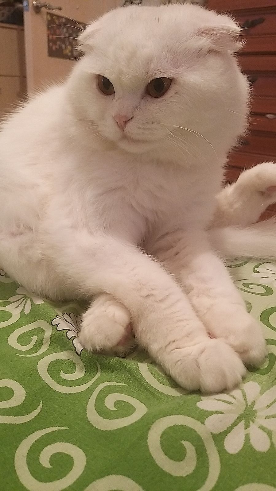 Кумовья так забрали кота, тоже шотландец, они обычно спокойные, размеренные. Забрали не котёнком, в год.