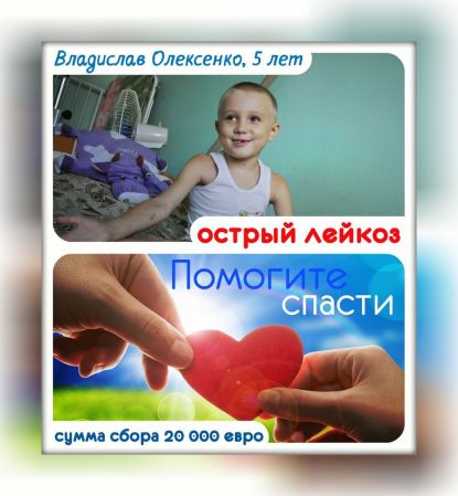 Влад родился и рос абсолютно здоровым активным и не по годам взрослым малышом. Когда ему было 3 года, из семьи ушел папа. Мама осталась одна растить и воспитывать малыша. Всё было неплохо, но в июне 2013 года, как гром среди ясного неба, прозвучал диагноз врачей - Острый Т- линейный лимфобластный лейкоз, вторичная кардиомиопатия. Это редкий вид рака крови. В нашей стране трое деток с таким диагнозом и наши врачи против него бессильны. Владу нужна пересадка костного мозга от неродственного донора, которую ему могут сделать только за границей. Нами был получен счёт из Университетской клиники Вюрцбурга, Германия на сумму 210 000 евро. Счет включает в себя проведение полного обследования, нескольких блоков химиотерапии по специальной схеме и ТКМ.
