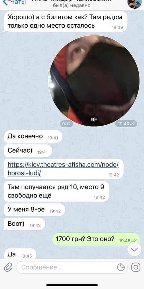 Переходим с ней в телегу, и собственно возникает у нас диалог (см. скрин чата). В трех словах: Анна (так она назвалась) спрашивает «так а че с билетом?», ну и я такой мол «бросай мне ссылку ща куплю себе билет», она бросает, я захожу по ссылке и удивляюсь чуть - в театр Золотые Ворота (впервые вчера о нем узнал, но такой оказывается есть) на какую-то постановку «Хорошие люди» Чехова билеты от 900 грн до 2700 грн. Билет который «последний остался» возле моей спутницы стоил 1700 (серединка такая, вроде и не самы мажор в первых рядах сидеть, но и не лох на галерке сидящий). Я чуть охрене, сказать по правде, всегда в театры ходил за 100-300 грн, а тут косарь семьсот.
