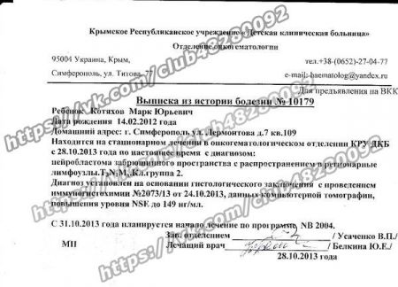 С 28 октября Марк вместе с мамой находится в онкогематологическом отделении г. Симферополя, начата химиотерапия по протоколу для нейробластом NB 2004. Блоки малыш переносит плохо, постоянно скачет давление, иногда достигая критических показателей. Постоянно нужны доноры крови.