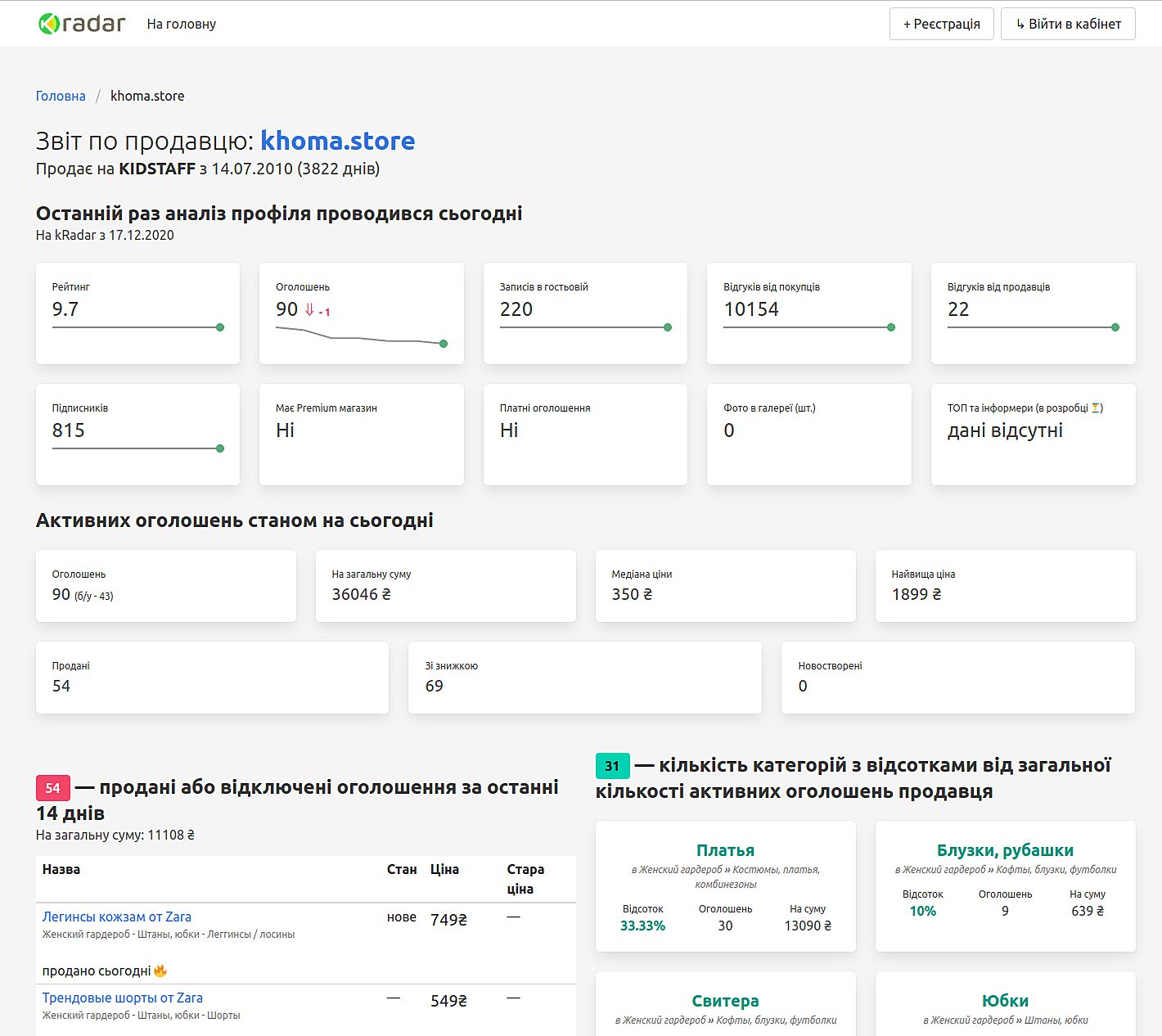 Как узнать, что продается у конкурентов здесь - на Кидстаффе? Просто заходить на их страницы каждый день и смотреть глазами, какие объявления продались, а в каких изменилась цена, сколько новых отзывов добавилось и записать это куда-то, занимает уйму времени и почти нереально для меня. Есть еще такие фанатики как я? :))) Сайт kRadar делает это за меня. Вот пример продавца ( ), который торгует б.у. женской одеждой - 53 продажи!!! после снижения цены, каждый день продажи идут. Или вот продавец товаров для детей ( удалено ) - 15 продаж! и также цены снижает и продает. Так что, не надо рассказывать, что здесь ничего не продается, продавалка умерла, и т.п..., просто нужно иметь ходовой товар и адекватную цену. Еще меня удивило, что на Кидстаффе есть продавцы у которых товара больше чем на 1.000.000 гривен. Есть куда стремиться.. Просто включаем голову и работаем! Всем удачи в новом 2021 году!