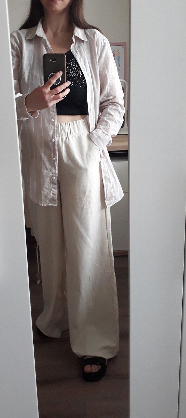 Красивые пропорции тела и такие безликие вещи! Понравились только брюки на фото 2. Поищите в продавалке, может есть атласные майки Mango на тонких лямках. Либо яркий топ. Только не бледная мятая рубашка.