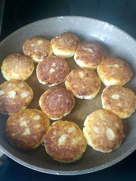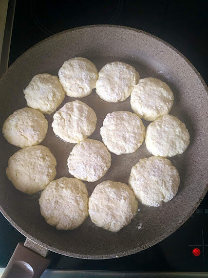 А я без муки делаю, вернее только обваливаю в ней , а так творог, яйца, сахар. У меня обезжиренный творог. И жарю без ничего на сухой сковороде .
