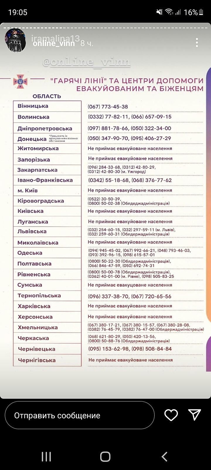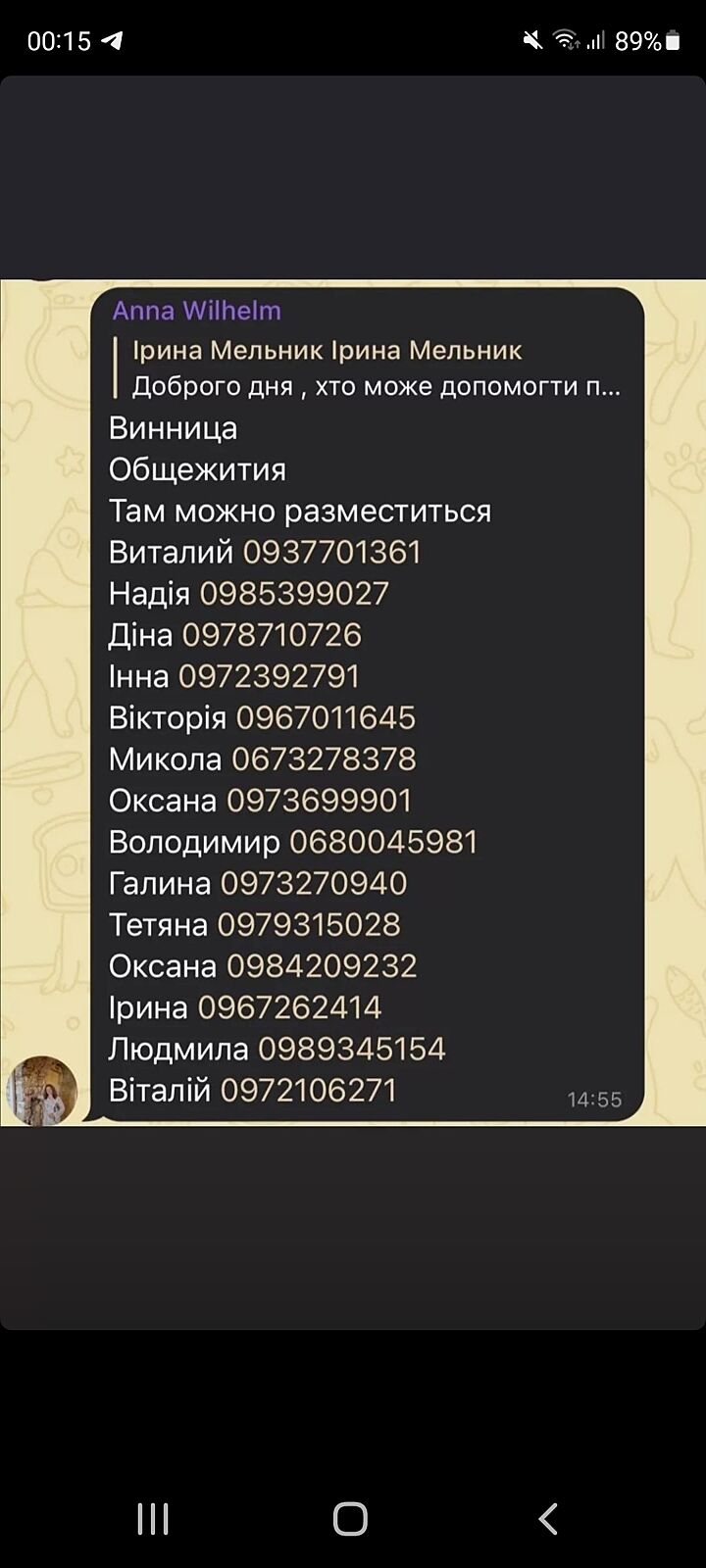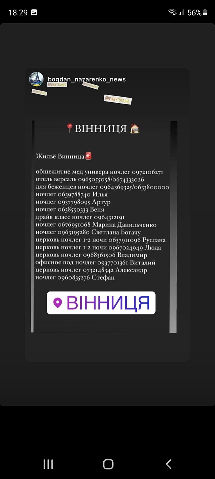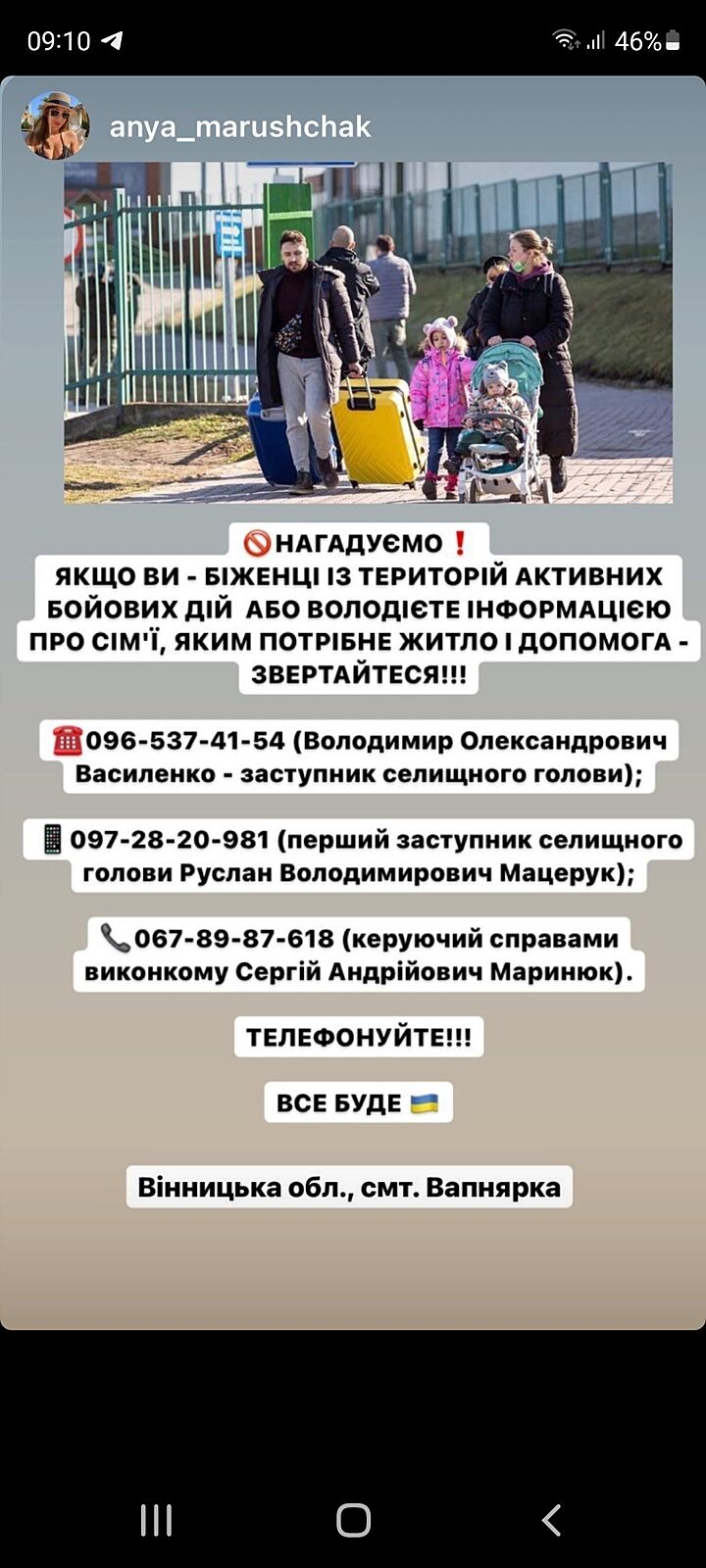 До Вінниці продовжують приїздити біженці. Для людей створено місця, де за потреби їх можуть нагодувати, дати теплі речі, забезпечити місцями для ночівлі. Біженцям, яким необхідне тимчасове поселення, потрібно звернутись до контактних осіб, закріплених за закладами. У разі відсутності місць в одному закладі – потрібно телефонувати в інші.