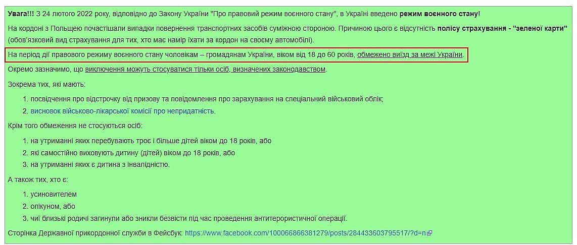 Окрім того ДПС України у своєму повідомлені зазначила, що громадянам України чоловічої статі віком від 18 до 60 років заборонено виїзд за межі України. Тобто, чоловікам, яким виповнилось 60 років дозволено перетинати кордон.