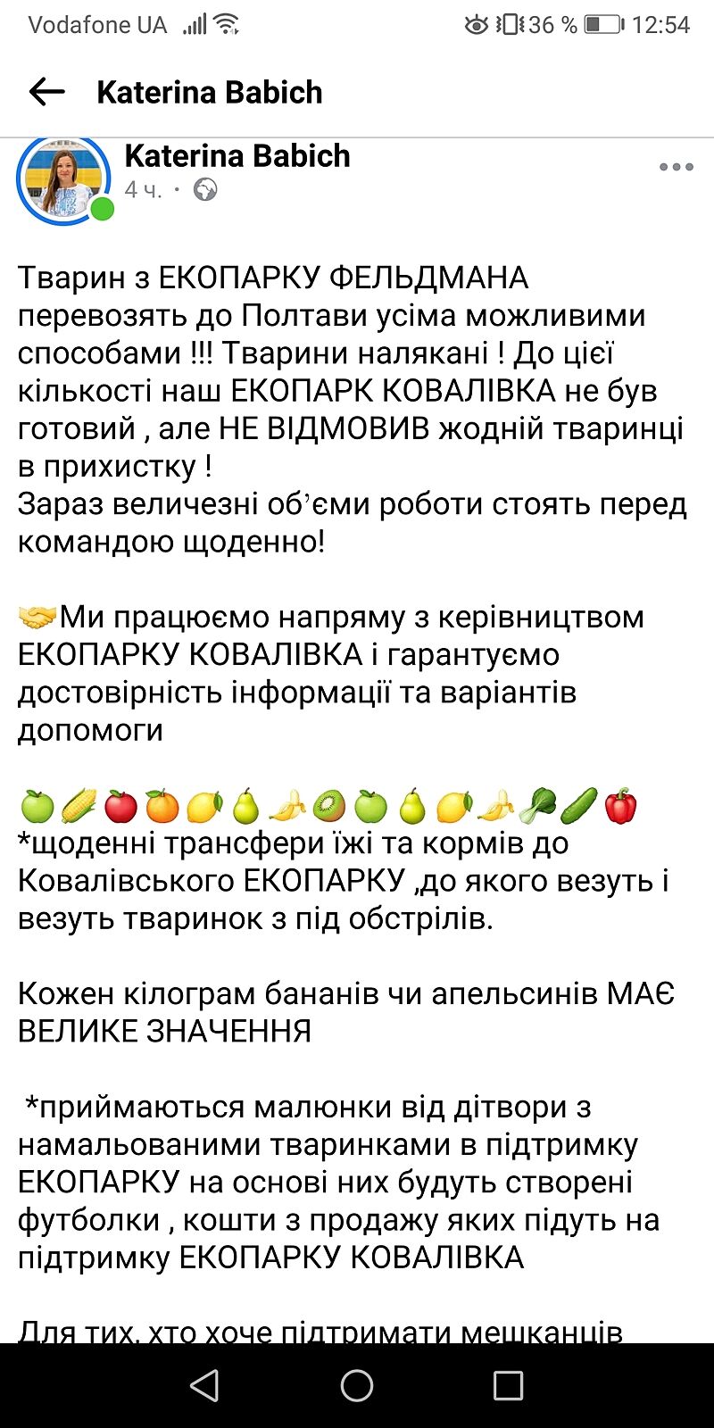 Я с Полтавы. Семьей планируем передать что-то с овощей фруктов в Экопарк в Ковалевке. Туда эвакуировали часть животных с Экопарка Фельдмана (Харьков). Состояние зверюх после всего треша явно видно по последнему фото...