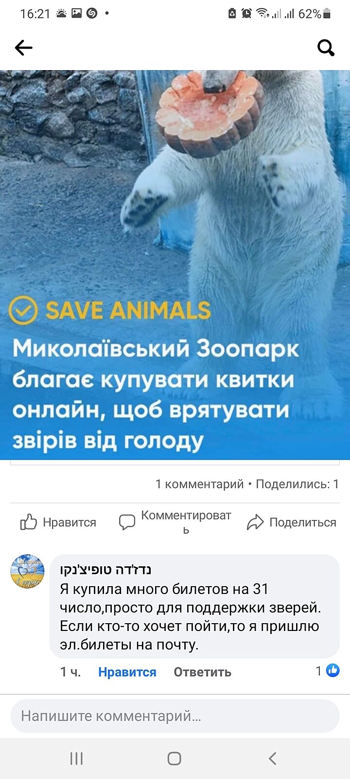 Не понимаю почему они не сделают продажу онлайн билетов, как в Николаевском зоопарке. Практика показывает, что так больше отклик. Те кто может 25-60-100 грн перечислить с удовольствием откликаются на такую покупку билетов, с миру по нитке... Все, кому кидала ссылку - купили, а на рассчетный счёт платят намного хуже. Неудобно или маленькую сумму стыдно переводить - незнаю, но так есть.