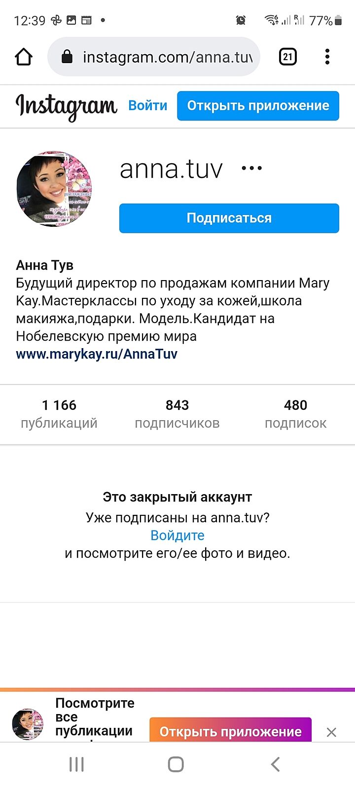 Фейсбук она уже закрыла профиль, но там основная масса её подписчиков иностранцев, которые ей верят и очень сочувствую. Что то можно сделать с аккаунтом? Я сегодня начала писать в её клиентах, она закрыла профиль. И ещё есть аккаунт в Инстаграм, приступаем?)