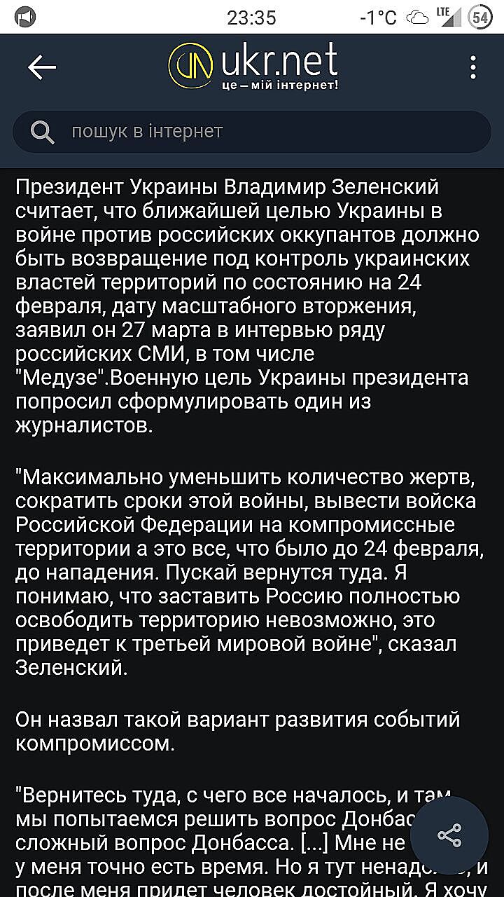 Изучайте- он просит Россию отойти на компромиссные территории, которые были по состоянию на 24.02