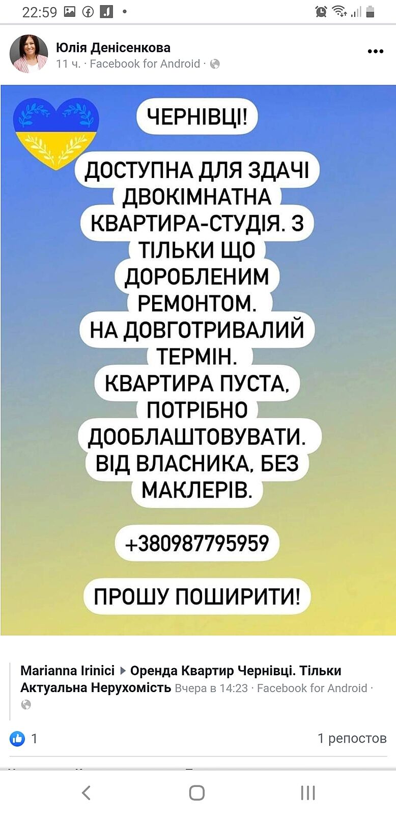 Я с 24 марта ищу квартиру в Черновцах. Смотрю олх, лун, добово (или как то так). Подписана на группы в вайбер и телеграм. Временно заселилась в мини отель на границе черновицкой и франковской областей, и вот я все ещё тут. Во многих объявлениях вижу ’без маленьких детей’, ’дети от 12’, ’без грудничка’, а у меня 4 года и 3 месяца. То прозваниваю, а номер не действительный. То собираюсь набрать, а вижу в группе, что мошенники. То аренда от 6 месяцев. Ну, или дороже чем я живу сдесь. Так что, удачи Вам, автор