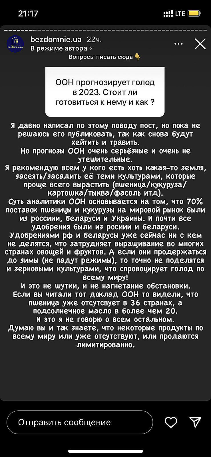 5) автор з посиланнями на дані ООН стверджує, що в Україні буде голод і радить активно засівати. Але чомусь він замовчує, що дані ООН стосуються не України, а країн, в які ми поставляли продукти. Але паніка вже запущена і по форуму несеться дискусія «що робити якщо в Україні голод?»