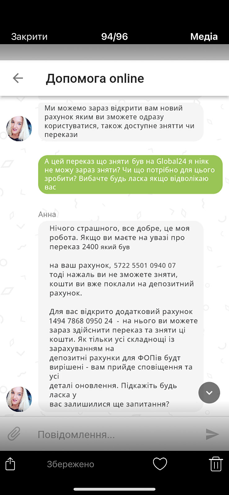 А сьогодні написала, що їй терміново потрібні кошти за другу половину місяця, тому що її дочка повертається з закордону і вона не може їй скинути гроші з рахунку глобал, і знову скинула мені скрін переписки з оператором, і що їй відкрили новий разунок, з якого її дочка зможе зняти гроші. Мені потрібно скинути кошти на цей рахунок.