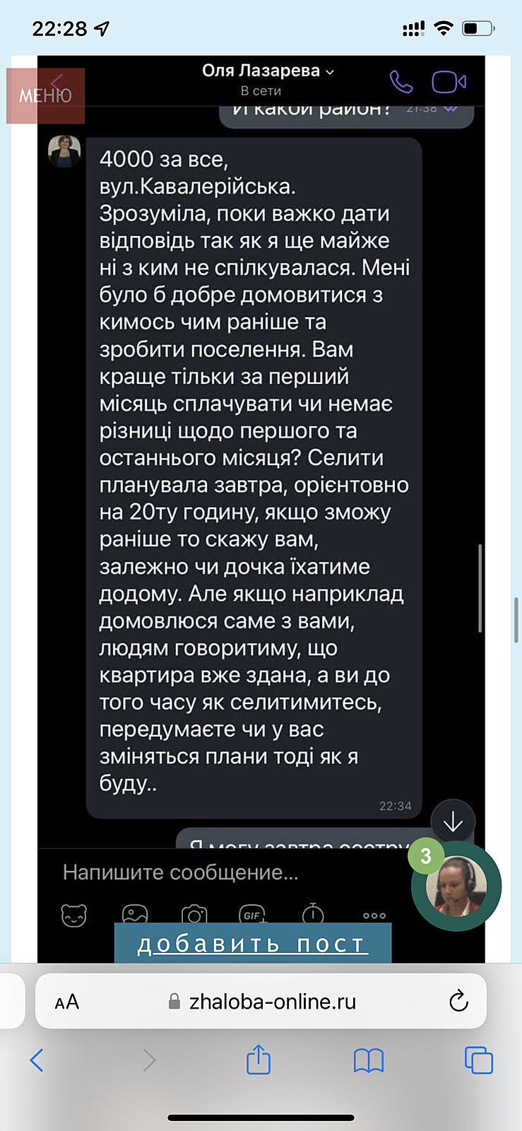 Мене збентежило й те, що я жодного разу не розмовляла з власницею, так як за номером телефону на який я дзвонила, і з якого вона мені писала, жодного разу не було гудків. Також вона дуже швидко давала розгорнуті відповіді у вайбер, скоріш за все типові заготовки. В результаті я накінець ввела її призведе в Google і побачила, що я у неї вже не перша. Але б хотілося, щоб була остання.