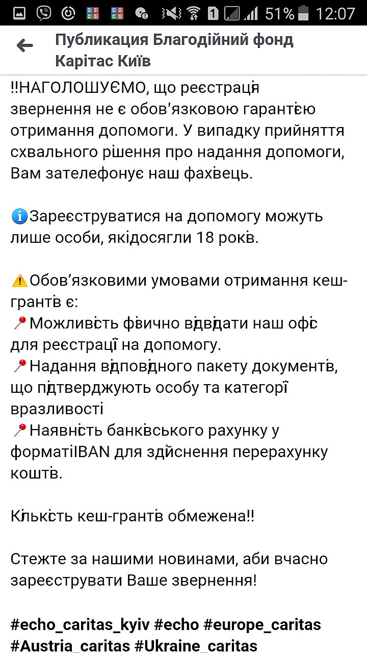 Девочки, добрый день! Увидела в Фейсбуке Фонд Каритас Киев начинает решистрацию на выплату помощи домохозяйствам, 20 евро. Там условия: инвалиды, одинокие люди старше 60 и т.д. Нужно заранее зарегистрироваться, иметь возможность физически посетить фонд и оформить документы. Если можно ссылку давать, то я добавлю.