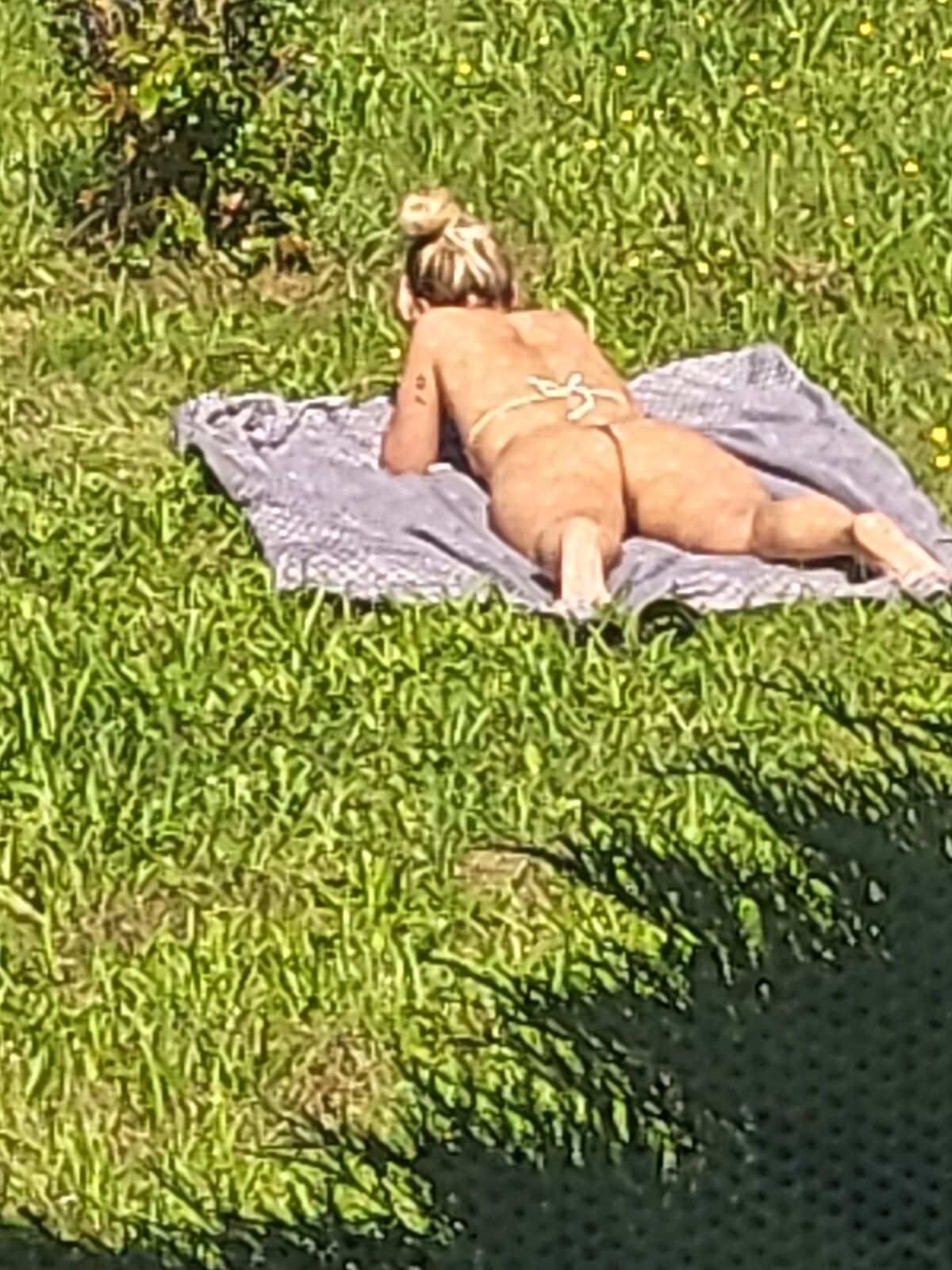 Она одетая. Поза обычная для загорания. А ребенка можно чем-то занять, чтобы не глазел, как мама, на чужую опу.