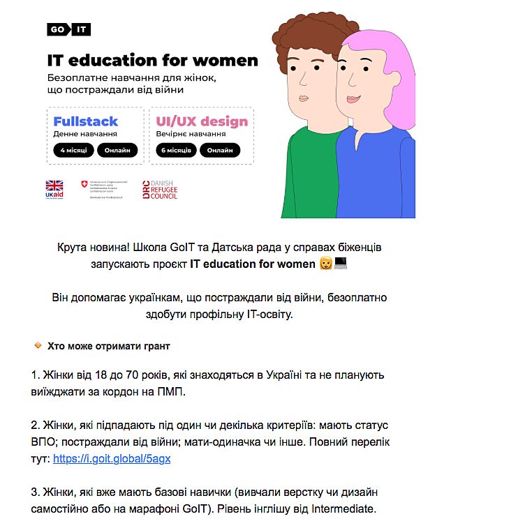 "Крута новина! Школа GoIT та Датська рада у справах біженців запускають проєкт IT education for women 👩💻