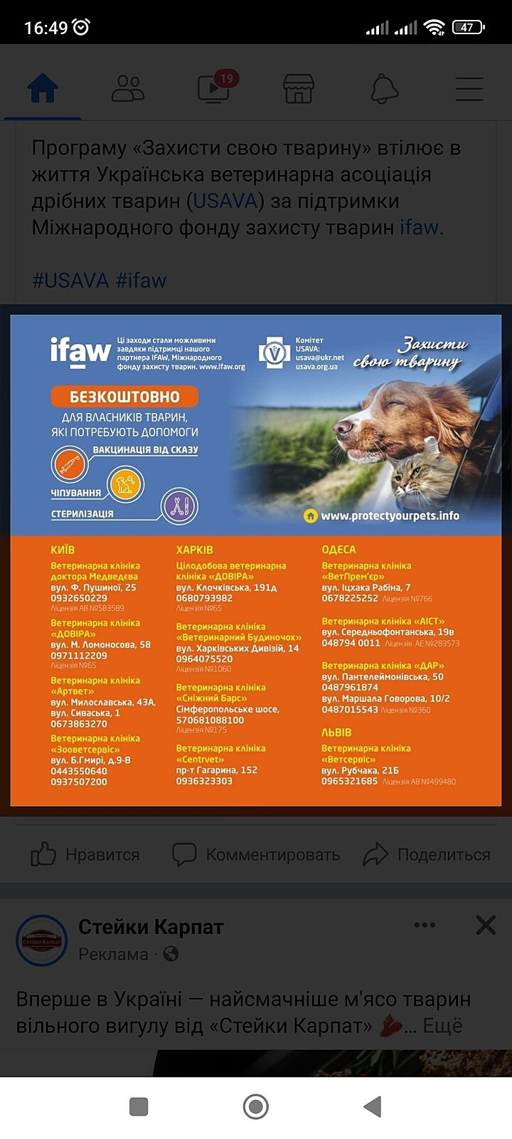 Ваші чотирилапі улюбленці можуть бути безплатно вакциновані від сказу, чіповані та стерилізовані в клініках. що співпрацюють з програмою "Захисти свою тварину".