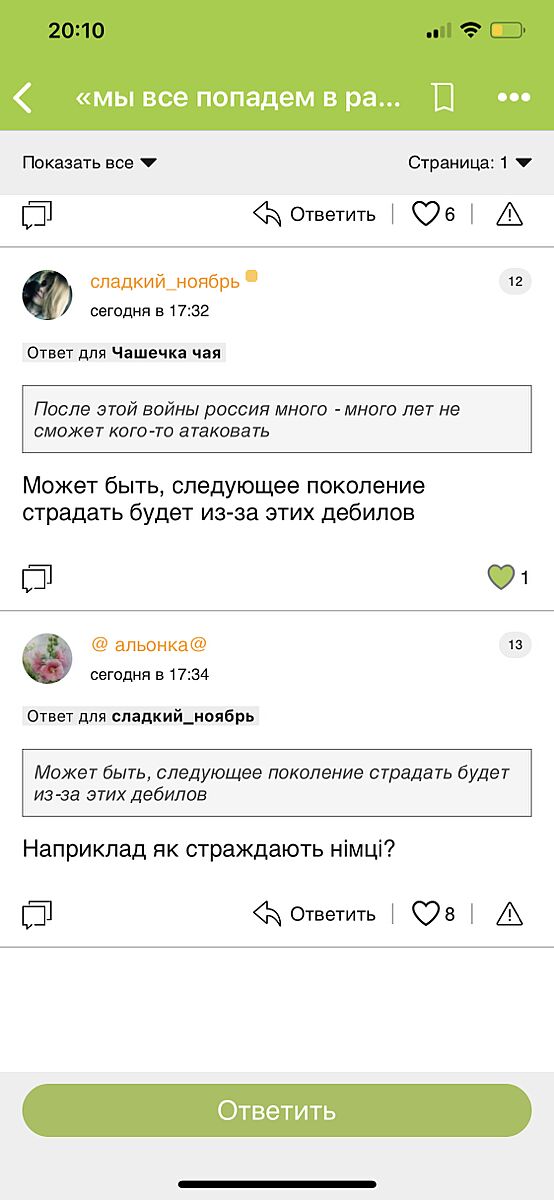 При чому тут ви,якщо я не вам відповідала,такі дивні ви жінки,маєте звичку влізти в розмову ,нерозуміючи про що мова ,це до чого ваше запитання?