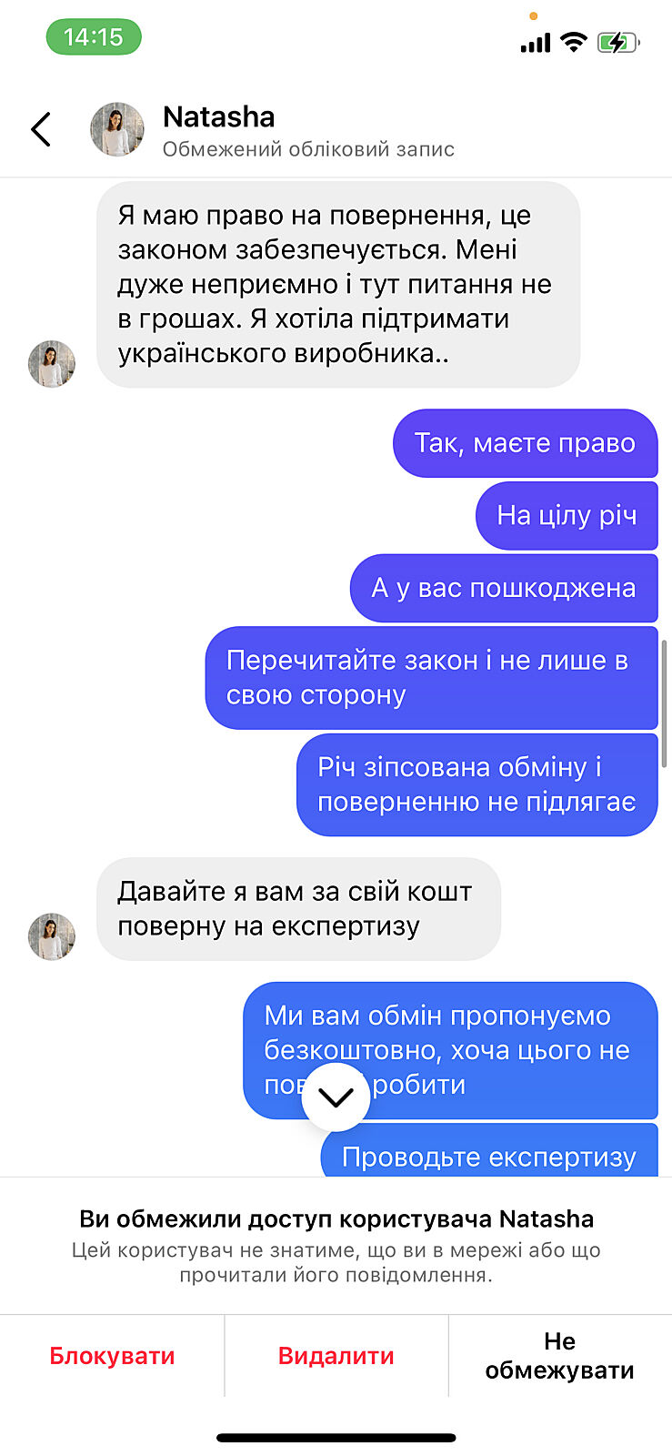До речі, обмін було як раз запропоновано у цій спірній ситуації за наш рахунок в 2 сторони на будь-яку річ та розмір. Ми максимально пішли зі своєї сторони вам на поступки, також від проведення експертизи ми вас не відмовляли, це ваше право 🙌🏻.