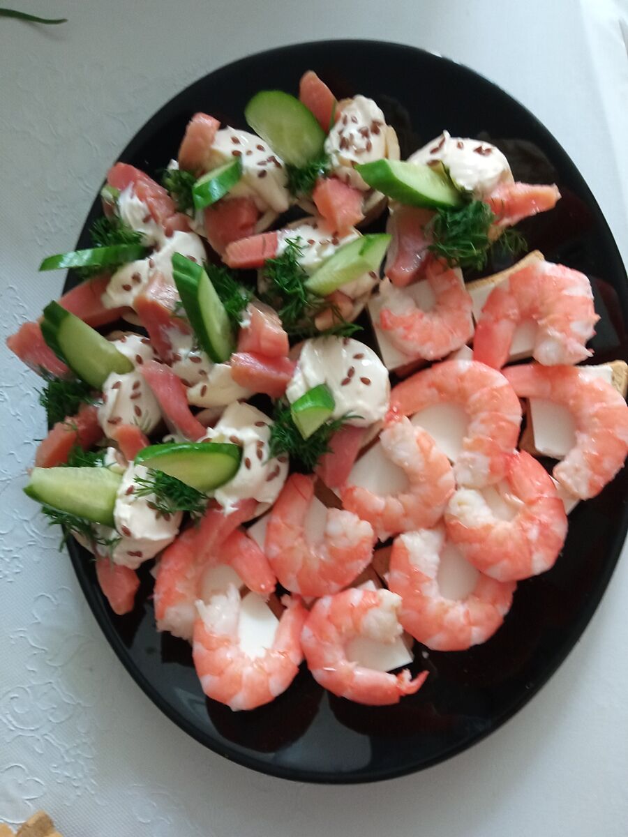 Автор, еще вкусно крупные креветки разложить так на тарелке, сырые или жареные, и каждую присыпать тертым яйцом, а сверху майонез или соус на его основе. Лучше домашний конечно.