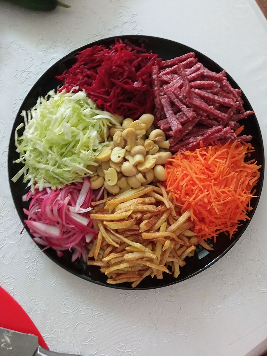 Картошка фри и т.д. кучки из свежих овощей это салат, перед подачей добавить майонез и двумя вилками все смешать