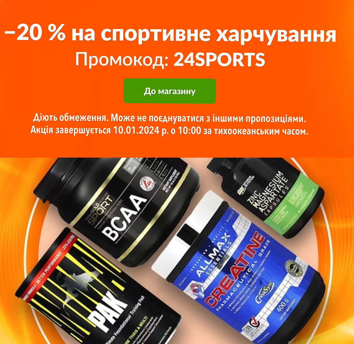 🏋🏼♀️ЗНИЖКА 20% за промокодом 24SPORTS на спортивне харчування